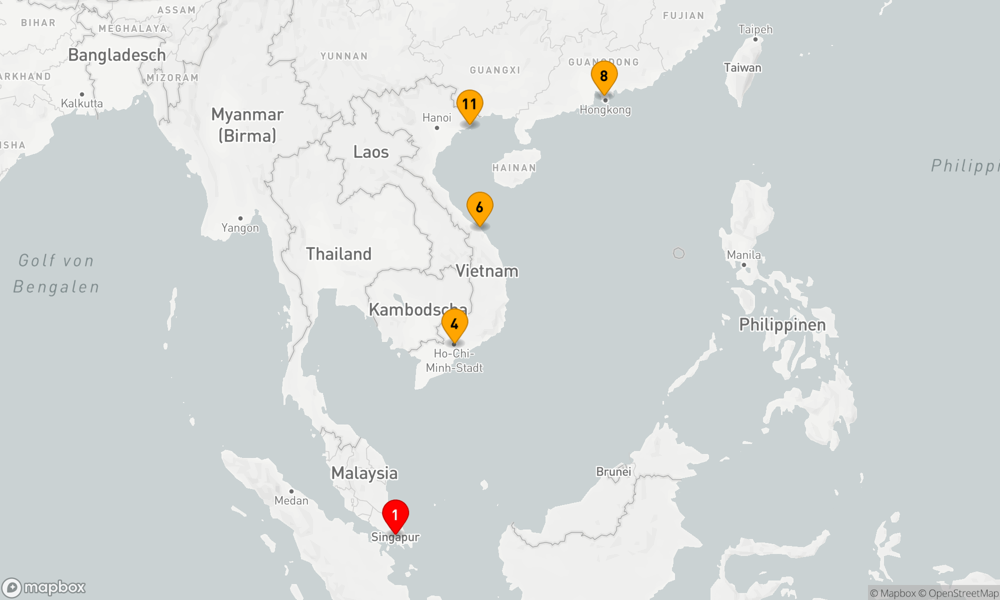 Beginn der Kreuzfahrt ist oft in Singapur, einem internationalen Drehkreuz, das mit regelmäßigen Direktflügen sehr gut von Deutschland aus erreichbar ist. Von dort geht es – je nach Kreuzfahrtroute – nach Malaysia, Vietnam, Thailand, China, Indien und Sri Lanka, Japan, Südkorea oder bis nach Indonesien.